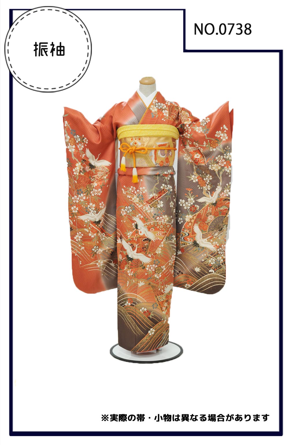 振袖 朱ブラウングレー染分鶴入扇面【0738】