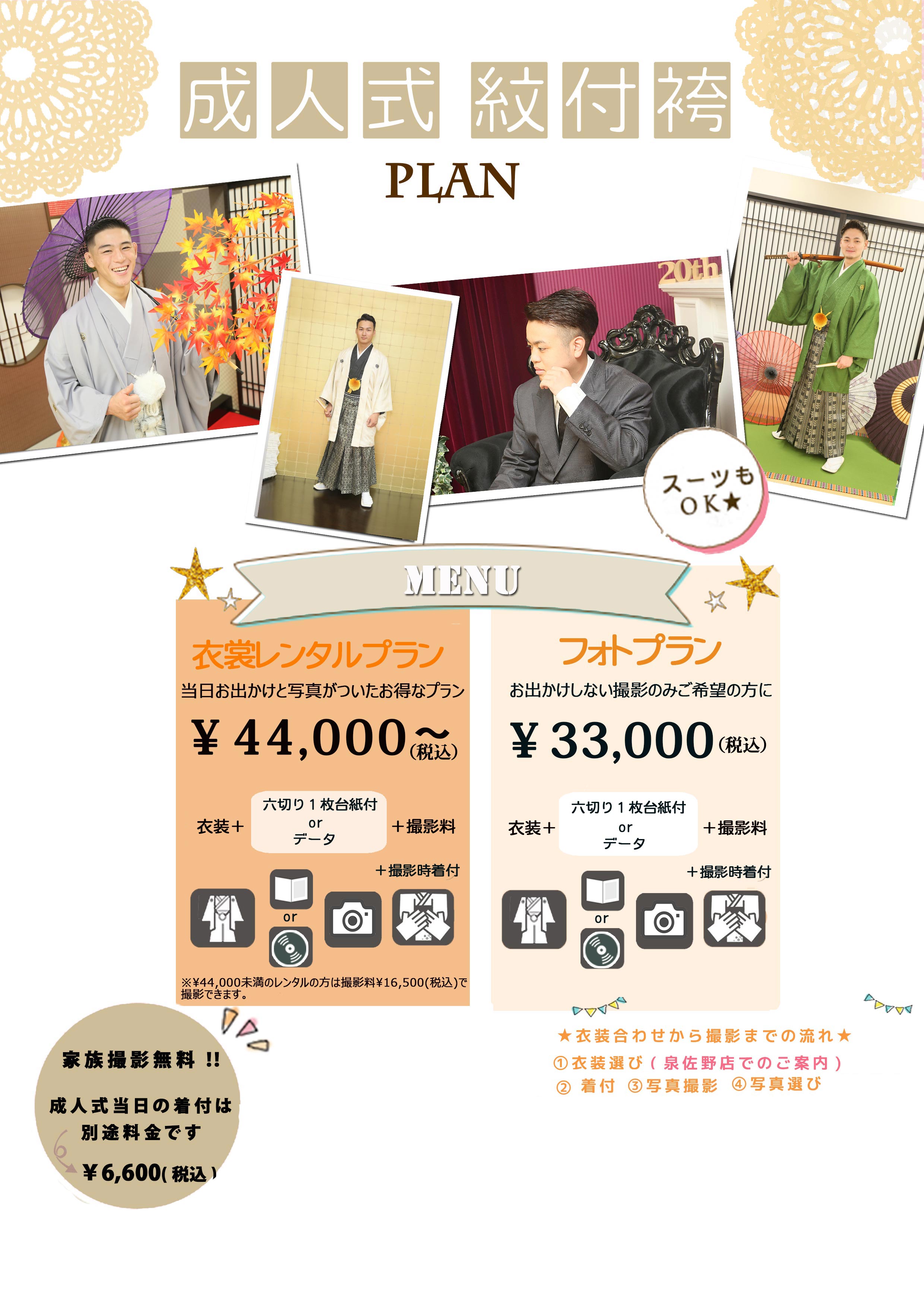 撮影・着付け・ヘアメイクすべて込みの安心プラン。